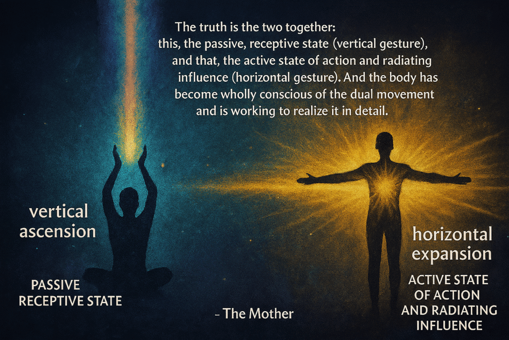 There are those who found this, the vertical ascent to the heights, and who isolated themselves from the world (they weren’t able to do that completely because they didn’t have the knowledge, but they tried). That’s not the solution. Then there are those who want to help, the generous ones who are like this (gesture of horizontal expansion), and who catch everything, even the mental illnesses of all the people around them. The truth is the two together: this, the passive, receptive state (vertical gesture), and that, the active state of action and radiating influence (horizontal gesture). And the body has become wholly conscious of the dual movement and is working to realize it in detail.